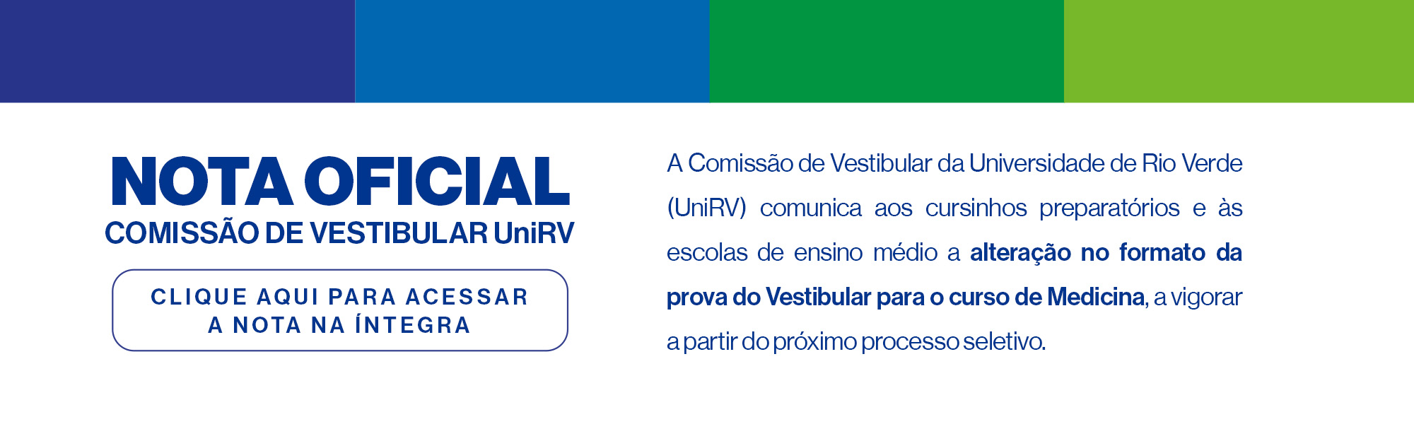 A Universidade de Rio Verde - UniRV é uma conquista histórica do povo rio-verdense. Nos últimos anos, cresceu, consolidou-se como Universidade de grande porte, tornou-se referência e uma das mais bem conceituadas do Brasil. Trabalho sério e de qualidade que é desenvolvido pela administração superior, docentes, servidores técnicos-administrativos e acadêmicos, e que tem se revertido em credibilidade acadêmico-científica junto à sociedade.