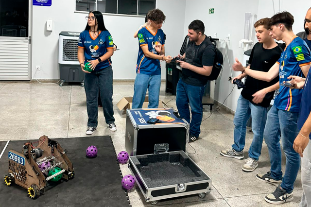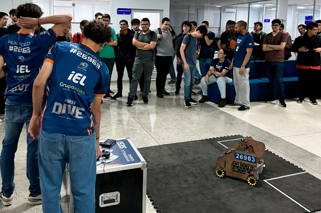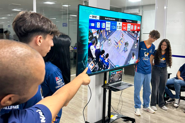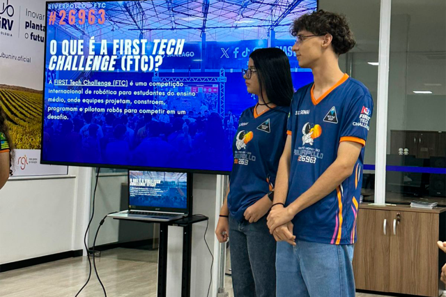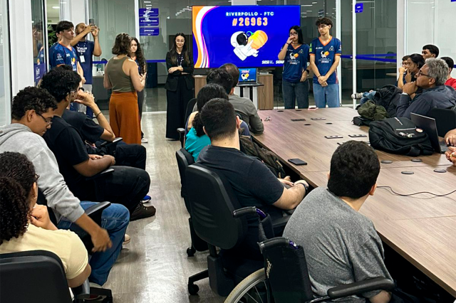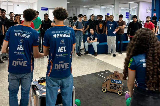 A palestra foi conduzida por professores do SESI/SENAI, Morgana e Ruan, acompanhados de alunos do Ensino Médio, integrantes da equipe competitiva Riverpolo, reconhecida pela participação em torneios de robótica.