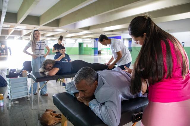 E nesta quinta-feira, dia 26 de fevereiro, uma equipe composta por quatro acadêmicos realizou atendimentos durante o período da tarde, no bloco administrativo, atendendo diversos servidores. “Hoje nós estamos fazendo terapias manuais, como liberações faciais e massagens relaxantes com servidores. Semanalmente a gente passa em cada um dos setores fazendo avaliações posturais, e também alguns exercícios para liberação da musculatura, prevenção de alguma disfunção,” explica a Professora.