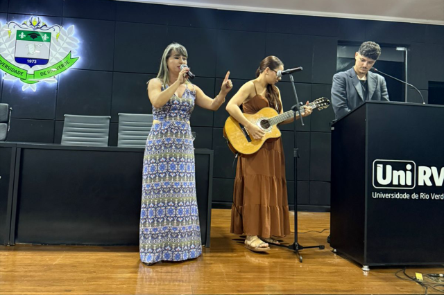 Em seguida, o Professor Dr. José Reinaldo Quintero, acompanhado das acadêmicas do 4º período, também realizou uma apresentação musical. A Professora Kênia Ramos da Cunha e a acadêmica Eduarda Barcelos finalizaram as amostras culturais da noite.